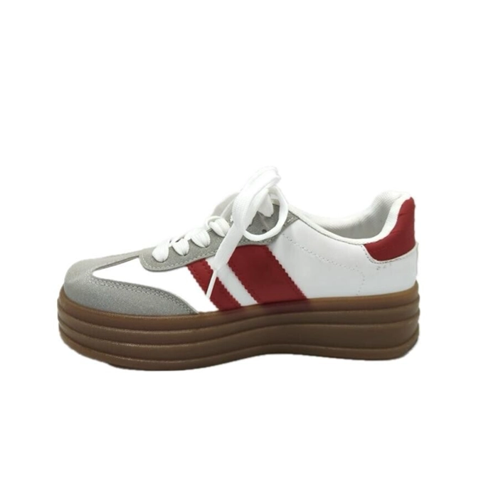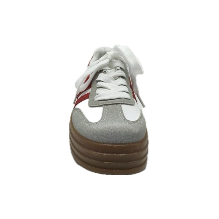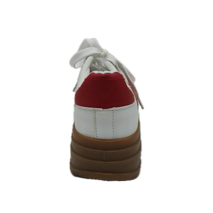 Su combinación en tejido napa y color en blanco y rojo crea un diseño moderno mientras la suela caramelo aporta un toque actual.